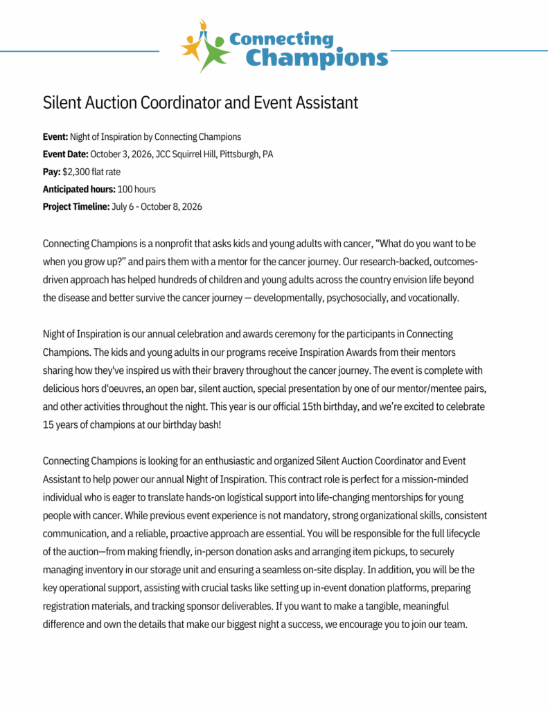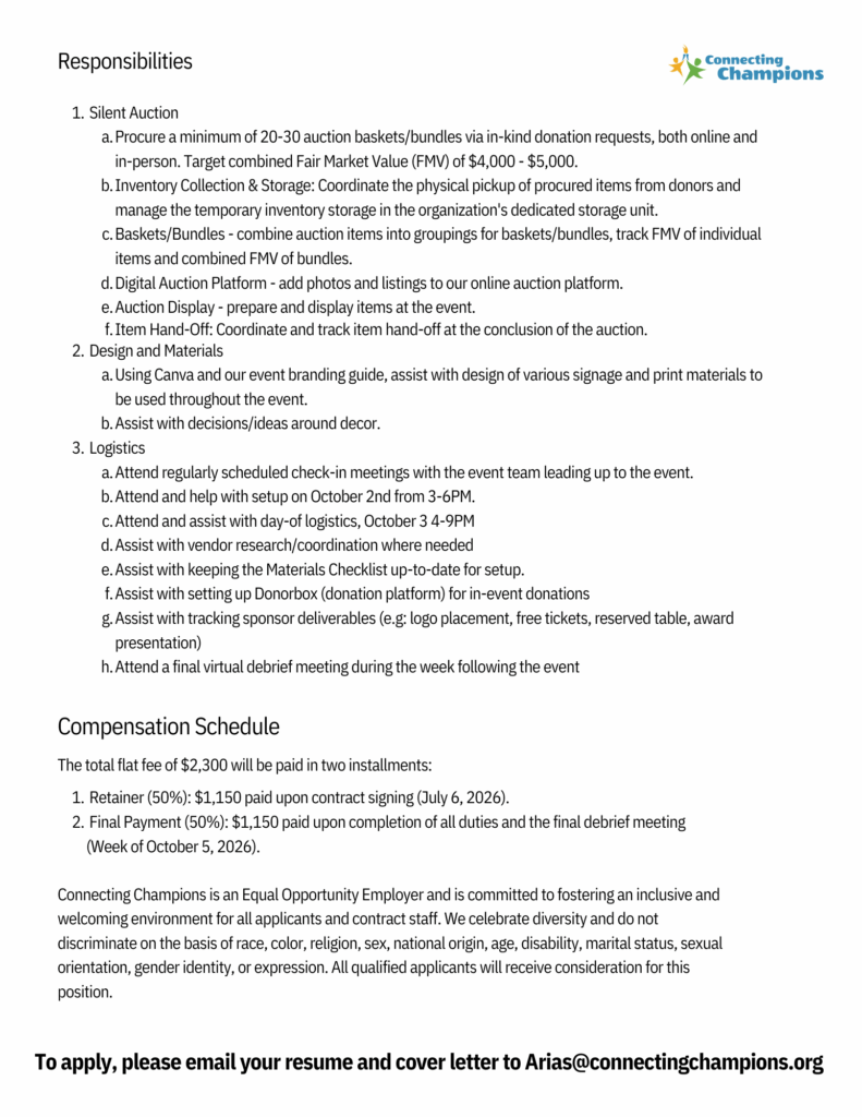 To apply, email resume and cover letter to Arias@connectingchampions.org